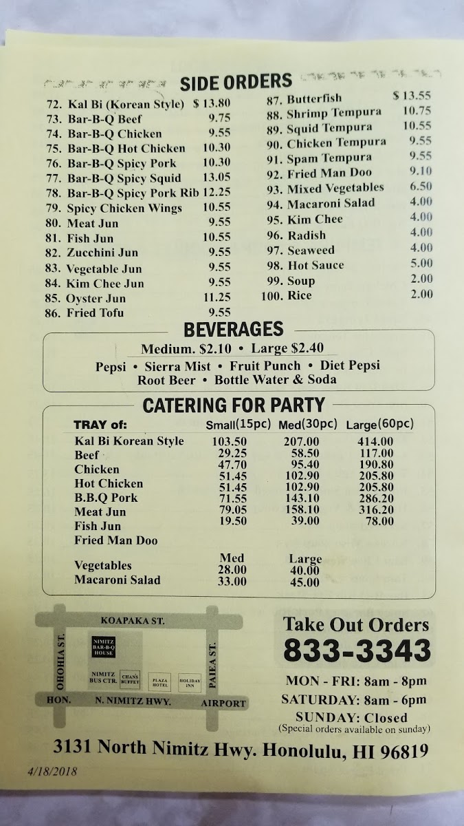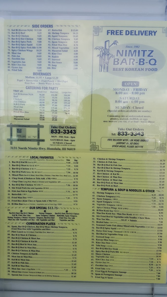At Nimitz Bar-Bq House Menu, you'll find a mouthwatering selection of BBQ dishes that showcase the perfect blend of smoky flavors and tender meats. Whether you’re in the mood for classic ribs, savory brisket, or juicy pulled pork, every dish is prepared with care, offering a true taste of comfort food. The menu also features a variety of sides, like creamy mac 'n' cheese, tangy coleslaw, and crispy fries, all crafted to complement the rich BBQ flavors. Located at 3131 N Nimitz Hwy, Honolulu, HI, this place is perfect for a laid-back meal with friends or family. Each bite is packed with deliciousness, making it an ideal spot to indulge in authentic, satisfying barbecue in the heart of Honolulu.