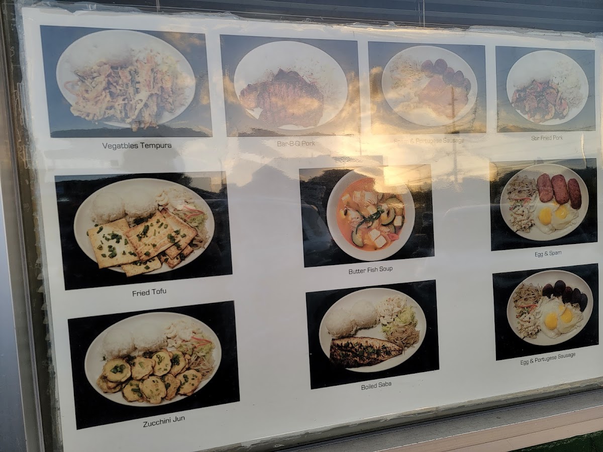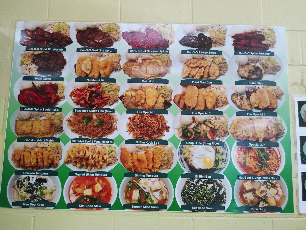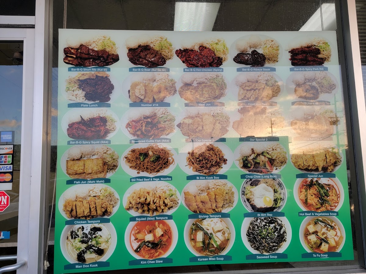 Bar-b-que beef, bar-b-que chicken kal bi, fried man doo, shrimp tempura, chicken tempura meat jun with vegetable and rice.