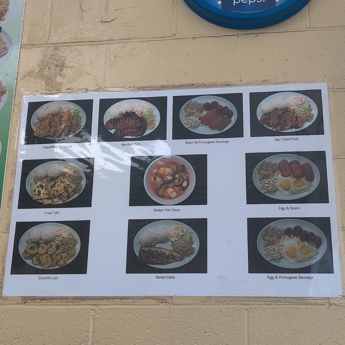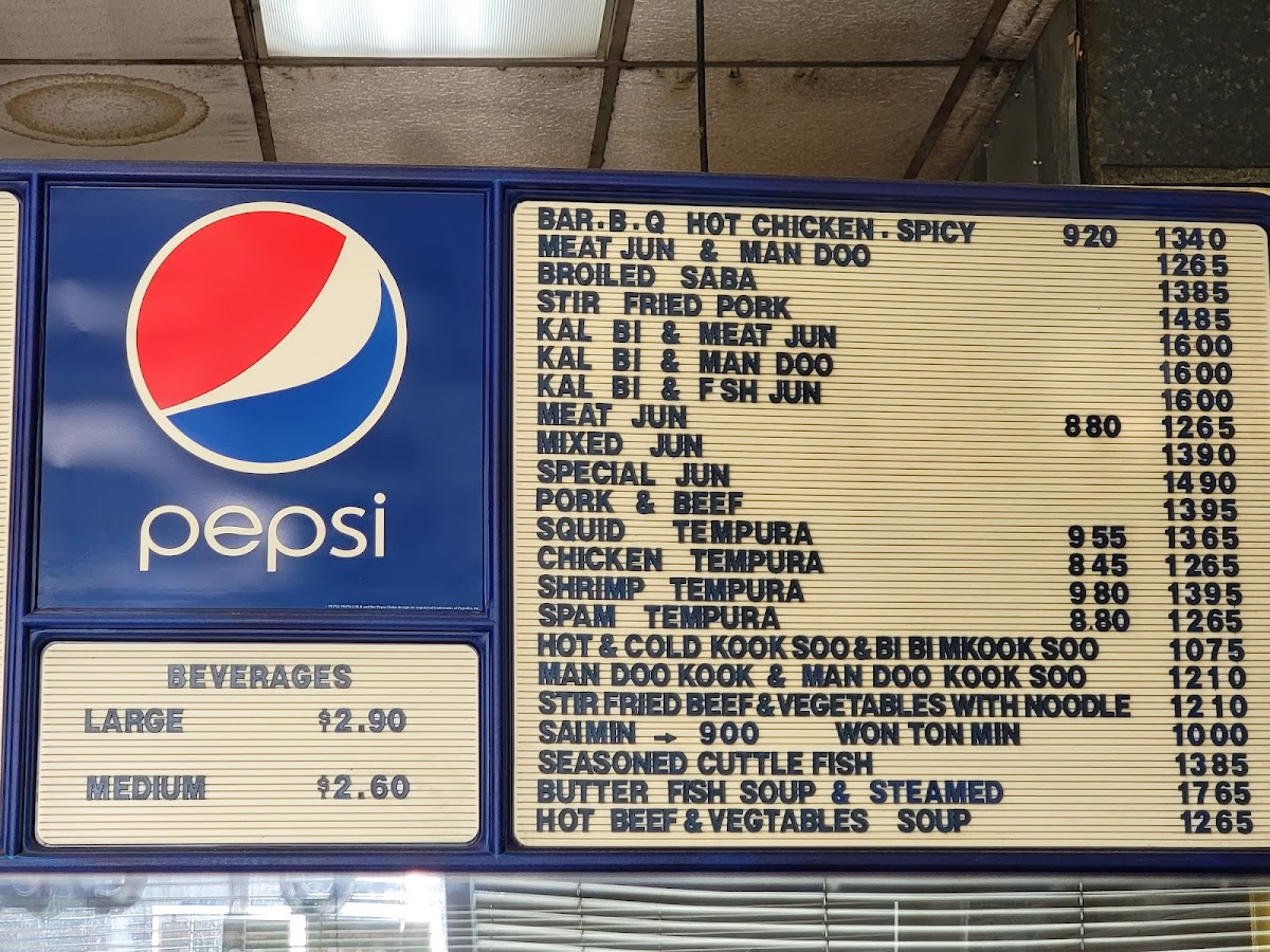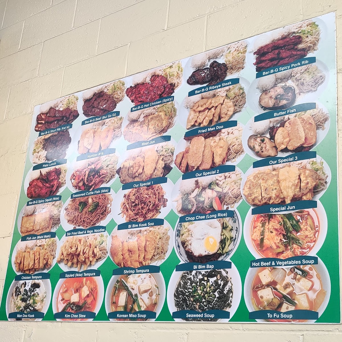 Bar-b-que beef, bar-b-que chicken kal bi, fried man doo, shrimp tempura, chicken tempura meat jun with vegetable and rice.